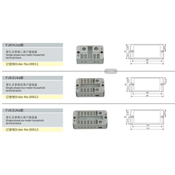 FJ6 Series terminal block for measuring box reaches the requirements of safe protection,gracefulness,convenienct connection, stable installation,etc.,It is suitable for the circuit of rated voltage 660V,frequency 50Hz or 60Hz,and connection conductor section at inlet terminal up to 2.5-50(70)mm2 and outlet terminal up to 0.75-1 6mm2.It employs direct crimping way by self-elevating screw clip that forms a self-locking structure between clip and screw, This structure enables terminal block not to loose under a shock.